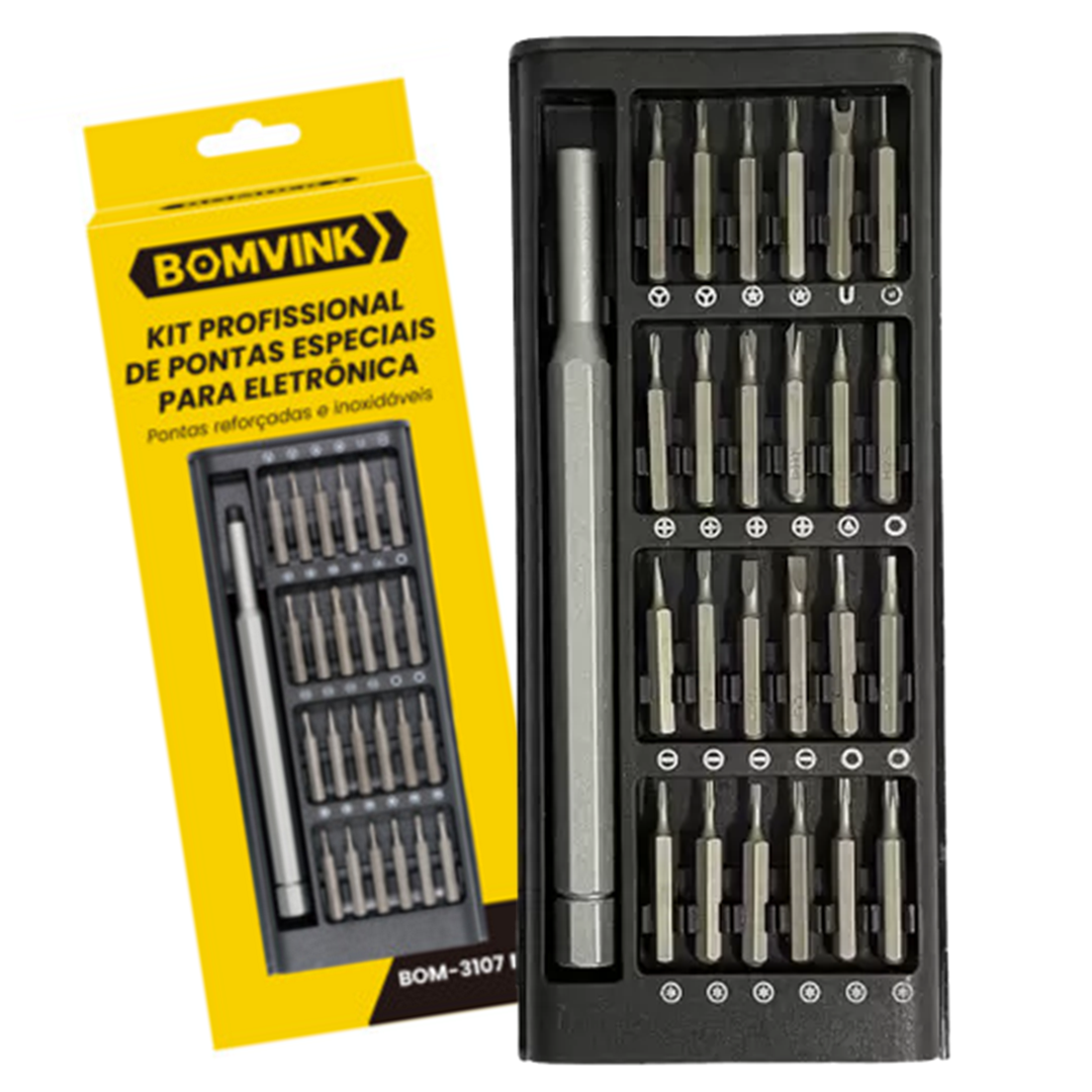 Sabe aquele parafuso minúsculo que ninguém consegue tirar? Agora você consegue! Com o Kit Bomvink BOM-3107, você tem em mãos um verdadeiro arsenal de precisão pra encarar reparos de celulares, relógios, óculos, câmeras, notebooks, consoles e muito mais - tudo isso com qualidade, organização e praticidade que fazem a diferença no dia a dia!
