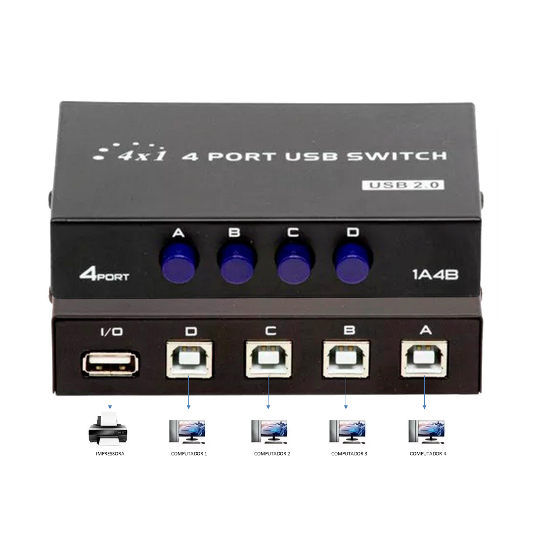 Dispositivo de compartilhamento usb 4 portas com interruptor manual na cor preto, switcher box para scanner e impressora.